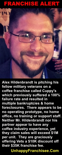 Alexander Hildenbrandt of Stonework Franchising is targeting military veterans with what he claims is a “Tried, Tested and Proven” opportunity called the Cuppy’s Coffee franchise. A little research indicates that the Cuppy’s Coffee concept was once a tried, tested and proven FAILURE that destroyed the financial well-being of dozens, if not hundreds, of families and resulted in numerous bankruptcies and home foreclosures. Is Alex Hildenbrandt using the leftover branding of a failed concept to lure fellow military veterans into a doomed investment? We invite him to say it ain’t so.