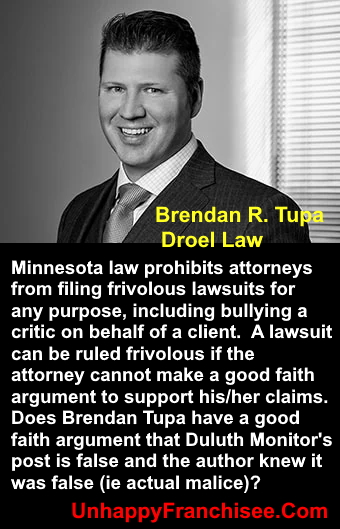(Unhappyfranchisee.Com) Brendan Tupa, the attorney representing embattled Mayor Chris Swanson in his bullying defamation lawsuit against blogger John Ramos and Duluth Monitor, is no longer with Droel PLLC.
