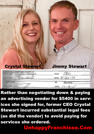 Sometimes Spouse CFO Crystal Stewart (then Crystal Sherrard) was sued for having signed a contract for billboard advertising the company never honored. The billboard company incurred substantial additional expense and lost time pursuing the debt and still never got paid.