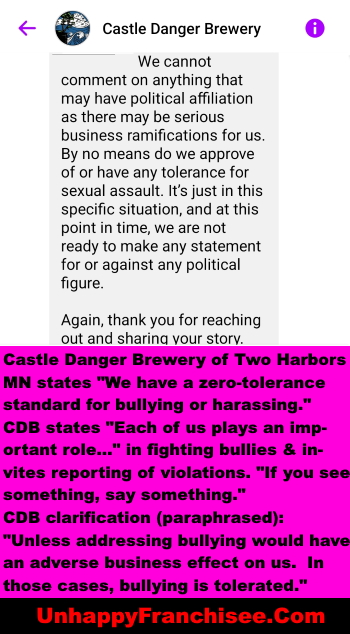 Castle Danger Brewery is either standing by silently while their public advocate, Mayor Swanson, is being unfairly harassed and bullied… Or they believe the allegations and only exercise their moral code when it’s in their financial best interest.