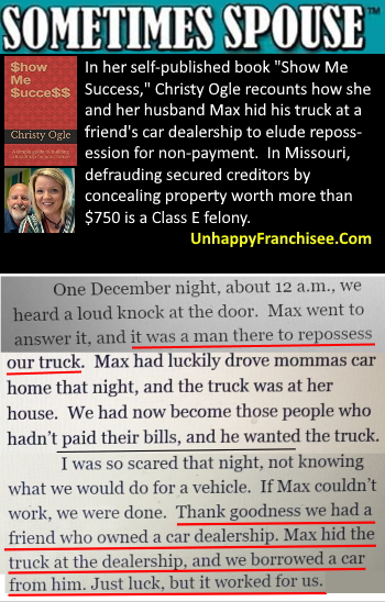 Christy Ogle, founder of Sometimes Spouse, admits that she and her husband Max once hid a truck to keep a secured creditor from repossessing it. An attorney says such an action is considered a Class E Felony under Missouri law. Current creditors claim history may be repeating itself as the Ogles petition for their 2nd bankruptcy.