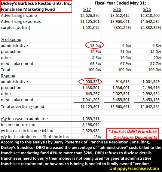 Barry Posternak, a former CPA and health club franchisee who now owns Franchisee Resolution Consulting, analyzed the Dickey’s marketing fund numbers reported in recent company franchise disclosure documents.