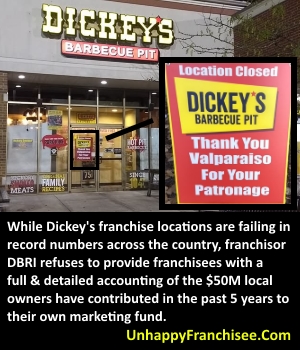(UnhappyFranchisee.Com) Dickey’s franchise owners, employees and customers continue to post the death notices of closed and closing Dickey’s franchise locations, dashed dreams and lost investments on our page DICKEY’S BARBECUE PIT Closed Location List.