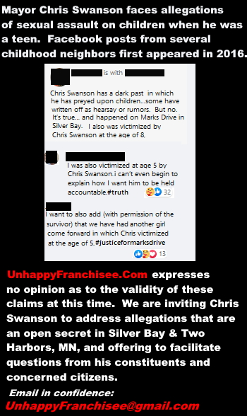 But the purpose of this post is not to express our opinion as to the validity of these accusations. We are inviting Mayor Chris Swanson to publicly address what’s been an open secret in Silver Bay and Two Harbors, MN… posted on Facebook for 6 years. And we are asking Two Harbors MN, its residents and businesses what national reputation they are choosing from this day forward.