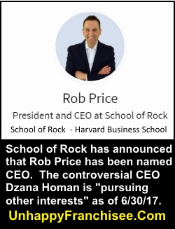 School of Rock has named Rob Price as CEO. The appointment comes after numerous complaints about bullying and intimidation tactics by CEO Dzana Homan were posted to the UnhappyFranchisee.Com website by School of Rock franchise owners. The controversy grew when School of Rock attorney Craig Tractenberg threatened a smear campaign against the web publisher if the complaints were not removed. Private equity owner of School of Rock has disavowed knowledge or approval of Tractenberg’s threats.